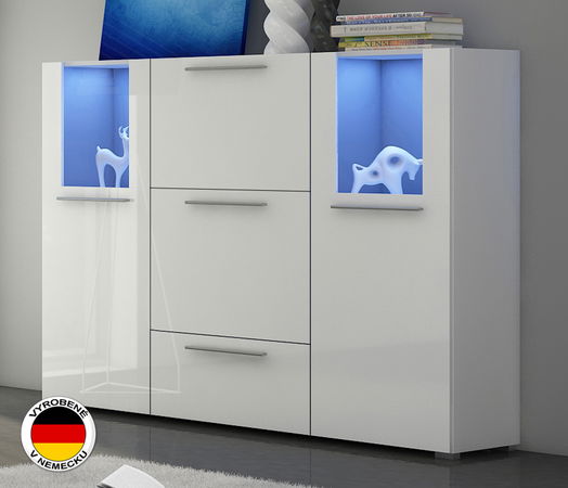Moderná vitrína, ktorú odporúčame kombinovať s obývacou stenou Wurzburg. Farebným prevedením ju môžete kombinova aj s ostatným nábytkom v miestnosti. Je vyrobená v Nemecku. Na výrobu boli použité kvalitné materiály. Do presklenej časti si môžete priobjednať efektné osvetlenie. Je modrej farby, čím navodí príjemnú atmosféru celého priestoru. Korpus je matnej farby, pričom fronty sú vo vysokom lesku.