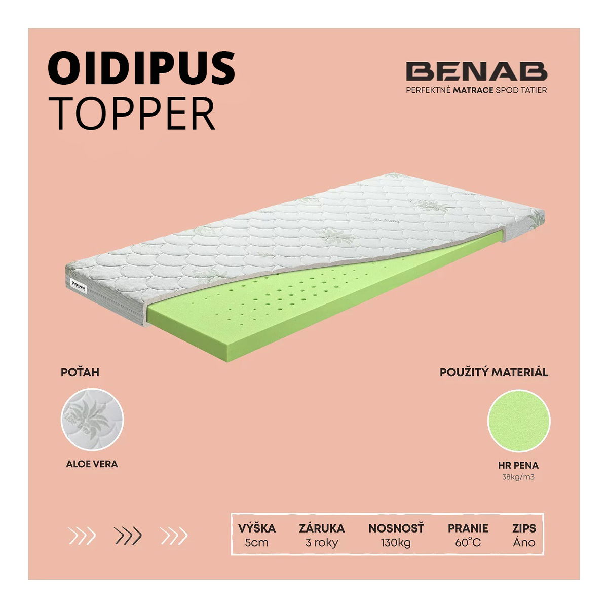 Vrchný matrac / Topper Benab Soft Atypický rozmer (cena za 1 m2) (T3) výška 5 cm je vyrobený z kvalitnej monoblokovanej pružnej a perforovanej HR studenej peny. Tento topper sa používa pre ochranu matraca pred nečistotami a zmäkčenie tvrdého matraca. Svojou 7-zónovou perforáciou zabezpečuje prevzdušnenie. Má tvrdosť T3 a dá sa prať pri 60 stupňoch. Topper má riešený zips pre jednoduché snímanie poťahu. Poťah Aloe Vera je príjemne mäkký a obsahuje extrakty výťažkov z Aloe Vera, ktoré zaručujú dostatočnú hygienu a regeneráciu pokožky ľudského tela. Je antibakteriálny a prateľný do 60 stupňov. Poťah je certifikovaný a zdravotne nezávadný OEKO - TEX standard. Pena je z HR 38 kg/m3 a poťah je prešitý s klimatizačnou výplňou PES vláknom 250 gr/m2. Zloženie poťahu je 85% polyester a 15% viskóza. Farba peny sa môže líšiť od vyobrazenia a nie je dôvodom reklamácie. Pri atypických matracoch sa vyžaduje zálohová platba vopred vo výške 100% z ceny matraca s DPH.