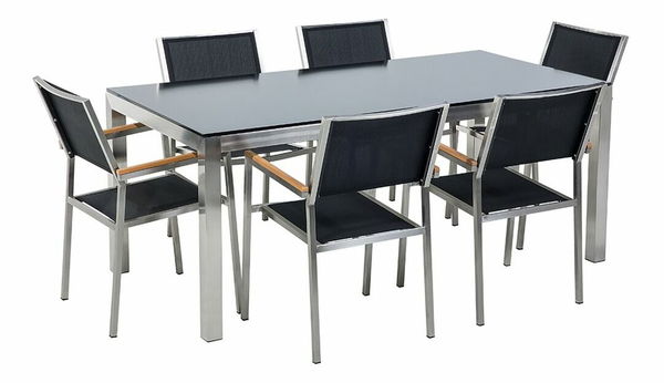 Exkluzívna záhradná súprava, ktorá dodá vašej záhrade alebo terase štýlový vzhľad. Vyznačuje sa krásnou kombináciou nehrdzavejúcej ocele a čierneho skla pre moderný vzhľad. Vrchná doska stola je odolná voči poveternostným vplyvom a jej tmavá farba dokonale ladí so strieborným rámom. Oceľový rám je odolný, čo zaručuje dlhú životnosť nábytku. Stoličky, ktoré možno stohovať, majú pevný rám a sedadlá a operadlá vyrobené z materiálu odolného voči UV žiareniu.