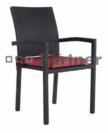 Stabilná záhradná stolička vyrobená z umelého ratanu s podrúčkami a vinovočerveným sedákom zdarma. Je stohovateľná, čo šetrí miesto pri jej skladovaní.