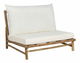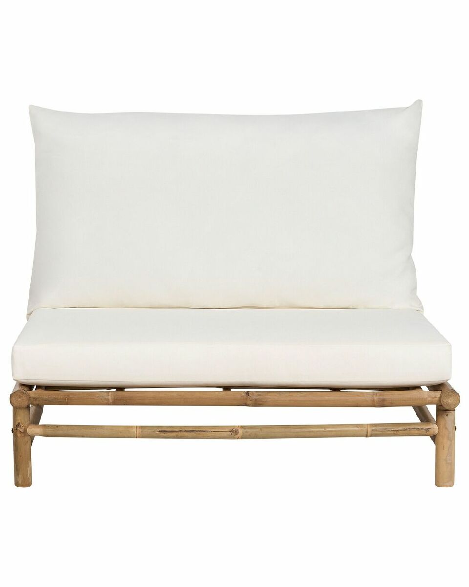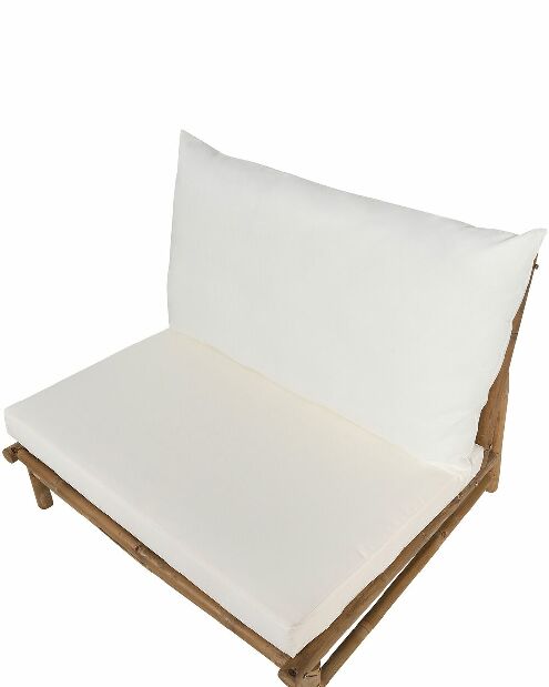 Toto bambusové kreslo bez podrúčok je dokonalým miestom na relaxáciu v interiéri aj exteriéri. Vďaka nízkemu rámu a širokému sedadlu, ktoré je vybavené bohato čalúnenými vankúšmi, zaručuje maximálne pohodlie. Vďaka prírodnému svetlému odtieňu dreva a krémovobielej látke vankúšov bez problémov zapadne do akéhokoľvek moderného dizajnu napríklad v škandinávskom alebo Japandi štýle.