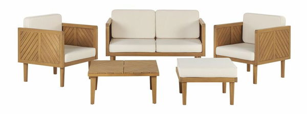 Vytvorte si moderný a pohodlný oddychový priestor s touto záhradnou sedacou súpravou, ktorá zahŕňa 2-miestnu pohovku, dve kreslá, konferenčný stolík a taburetku a ponúka miesto na sedenie pre 4 osoby. Súprava je vyrobená z kvalitného akáciového dreva, takže je odolná, stabilná a dokonale doplní vonkajší priestor. Súčasťou súpravy sú hrubé čalúnené vankúše, ktoré poskytnú správnu oporu a maximálne pohodlie. Užite si svoj voľný čas oddychom na tejto pohodlnej sedacej súprave.