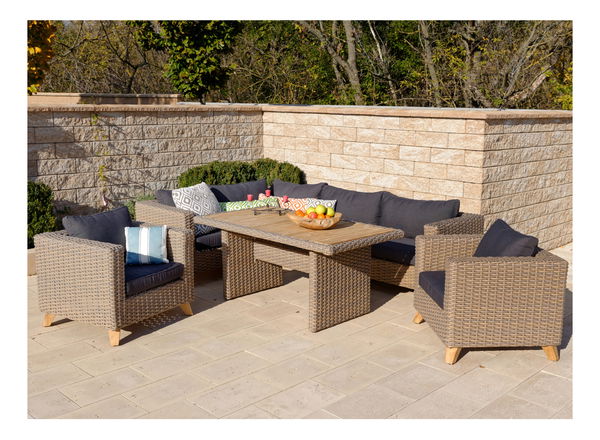 Priestranná a pohodlná súprava záhradného nábytku Comote v príjemných farbách sa stane neoddeliteľnou súčasťou vašej záhrady alebo terasy. Nábytok má zváranú hliníkovú konštrukciu s výpletom z umelého ratanu. Tieto materiály sú obľúbené pri výrobe záhradného nábytku, pretože sú bezúdržbové a výborne odolávajú vplyvom počasia aj UV žiareniu.