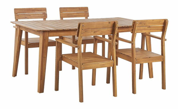 Pripravte sa na letné dni a stolovanie pod holým nebom s touto nadčasovou záhradnou jedálenskou súpravou. Skladá sa zo štyroch stoličiek a stola a je vyrobená z odolného akáciového dreva. Každá stolička má praktické bočné opierky a stolová doska ponúka dostatok miesta na stolovanie až pre šesť osôb. Táto jedálenská súprava bude skvelým doplnkom vašej záhrady alebo terasy.