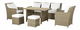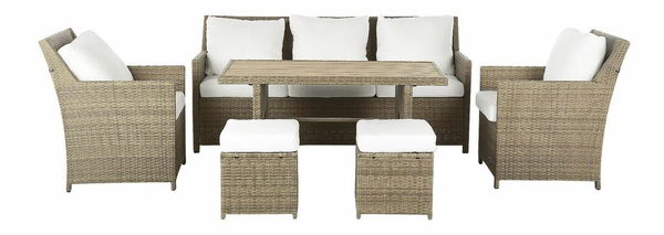 Vychutnajte si každé stolovanie v prírode a doplňte svoju záhradu touto záhradnou súpravou nábytku. Súprava pozostáva z pohovky, dvoch kresiel a jedálenského stola a je vyrobená z odolného umelého ratanu a hliníka. Vankúše na operadle a sedadle sú odolné voči UV žiareniu, majú pohodlnú penovú výplň a odnímateľné poťahy. Dva taburety poskytujú ďalšie miesto na sedenie a možno ich použiť aj ako podnožky.