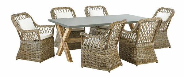Pripravte sa na leto a premeňte svoju terasu na štýlový jedálenský kút. Táto súprava priestranného stola a 6 ratanových kresiel vám zaručí ten najvyšší komfort. Doska stola je vyrobená z odolného vláknocementu, ktorý zaisťuje dlhú životnosť stola a zároveň je nenáročný na údržbu. Kreslá s výpletom inšpirovaným boho štýlom vyniknú v akomkoľvek priestore. Ich súčasťou sú aj bavlnené podušky na sedadlách a operadlách, ktoré majú snímateľné poťahy, a podložky na nohách, ktoré chránia podlahu pred poškriabaním.