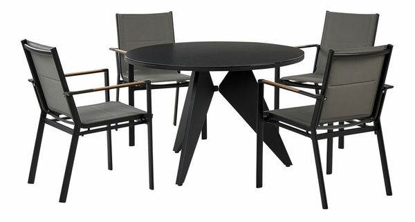Ak hľadáte pohodlnú jedálenskú súpravu do svojej záhrady, táto bude pre vás ako stvorená. Stoličky, čalúnené hrubou vrstvou materiálu s vysokými opierkami rúk, zaručujú nielen správnu oporu počas používania, ale aj skvele ladia so stolom. Ten má široké, geometrické nohy, ktoré dotvárajú moderný vzhľad celej súpravy. Nábytok je vyrobený z kvalitného a odolného materiálu, takže je ideálny na použitie v interiéri aj exteriéri.
