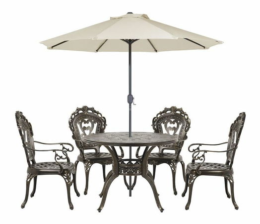Zlepšite vzhľad svojho vonkajšieho priestoru s touto jedálenskou súpravou inšpirovanou vintage štýlom. Súčasťou súpravy je aj slnečník, ktorý vytvorí príjemný tieň počas horúcich dní. Ľahká, ale odolná súprava s hliníkovou konštrukciou pozostáva z okrúhleho stola a štyroch stoličiek. Vyniká zaoblenými líniami, zložitými vzormi a hnedou povrchovou úpravou, ktorá mu dodáva jedinečný sofistikovaný vzhľad. Súprava zahŕňa štyri podložky na sedenie vyplnené ľahkou penou pre maximálne pohodlie.