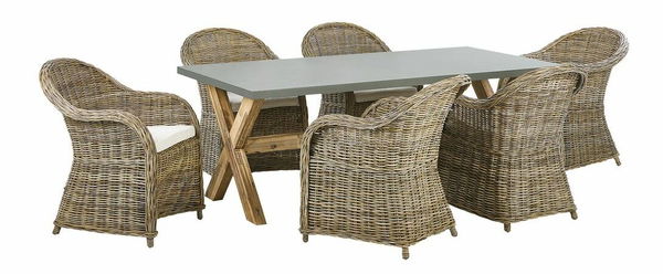 Premeňte svoju terasu na vonkajší jedálenský kút a pripravte sa na letnú sezónu. Táto súprava pozostávajúca z priestranného stola a 6 ratanových kresiel vám zaručí ten najvyšší komfort. Doska stola je vyrobená z vláknitého cementu, ktorý zaisťuje dlhú životnosť stola a výrazne uľahčuje čistenie. Kreslá sú vyrobené z ratanu, ktorý sa vyznačuje prirodzenou odolnosťou. Dodávajú sa so sedacím vankúšom, ktorý má snímateľný poťah pre ľahké čistenie, a s podložkami na nohách na ochranu podlahy.