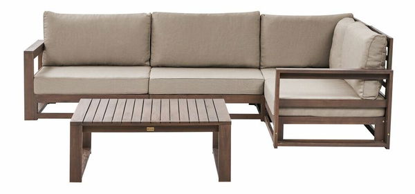 Táto klasická záhradná sedacia súprava sa dodáva s konferenčným stolíkom a sedacími časťami, ktoré možno spojiť do útulnej rohovej pohovky alebo použiť samostatne. Je vyrobená z kvalitného certifikovaného akáciového dreva v krásnom tmavom odtieni a je ideálna na oddych v záhrade či na terase. Vďaka hrubým vankúšom na sedadle a operadle v príjemnom odtieni a nízkemu rámu je ideálnym kusom nábytku pre každú modernú záhradu alebo terasu.