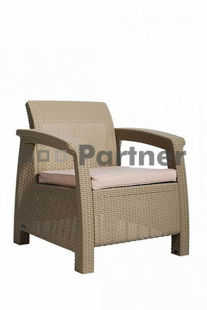 Moderné záhradné kreslo Corfu je vyrobené z umelého ratanu béžovej farby, vďaka ktorej dokonale zapadne medzi ostatné doplnky vo Vašej záhrade či na terase. Výhodou celoplastovej konštrukcie je, že je veľmi trvácna a nikdy nezhrdzavie alebo nespráchnivie. Kvalitný výplet je natoľko dokonalý, že pri bežnom používaní sa nikdy nerozpletie. Pre zväčšenie pohodlia pri sedení Vám dáme sedák zdarma. Konštrukcia, výplet aj sedák odolávajú vplyvom počasia, poveternostným podmienkam, vode aj UV žiareniu. Kreslo je dodávané v demonte, no montáž je veľmi jednoduchá a nezaberie Vám veľa času.