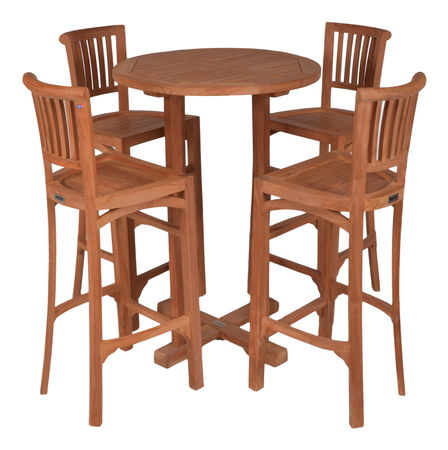 Záhradná barová zostava štyroch barových stoličiek a okrúhleho stolíka z tvrdého tropického dreva TEAK, vhodného pre výrobu záhradného nábytku. Vhodné pre záhradné kryté plochy a interiéry. Pri vhodnom ošetrení možno používať v exteriéri.