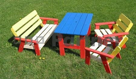 Detský záhradný nábytok pestro nafarbený si zamiluje každé dieťa. Set obsahuje stôl, lavičku s operadlom a dve stoličky. Certifikát FSC zakazníkom zaručuje, že drevo, z ktorého je nábytok vyrobený, pochádza z lesa, ktorý je obhospodarovaný šetrným spôsobom s ohľadom na princípy trvalej udržateľnosti.