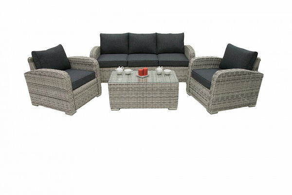 Elegantná záhradná zostava obsahuje 1x stôl, 1x 3-sed a 2x kreslo. Materiál je odolný voči UV žiareniu a teplote od +50°C do - 10°C. Celá zostava je vhodná ako do interiéru, tak aj do exteriéru.