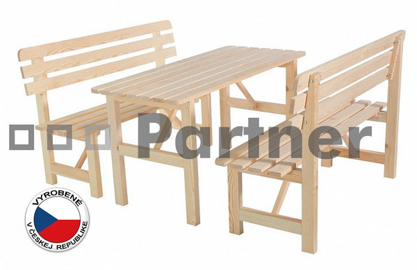 Pekná záhradná zostava vhodná ako posedenie počas grilovačky, či ako stabilne uložený set pre oddych vo Vašej záhrade alebo na terase. Je určený pre 6 osôb. Obsahuje jeden stôl a dve lavice. Je to kvalitný český výrobok vyrobený z masívnej borovice. Drevo je pasterizované sušením na 80 °C a jeho hrúbka je 22 mm. Stôl je dodávaný v demonte, bez povrchovej úpravy, vrátane spojovacích materiálov a montážneho návodu.