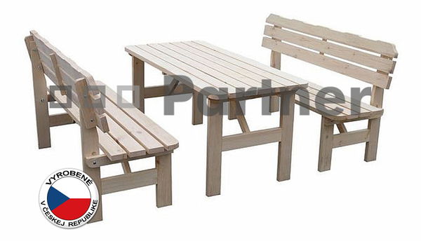 Pekná záhradná zostava vhodná ako posedenie počas grilovačky, či ako stabilne uložený set pre oddych vo Vašej záhrade alebo na terase. Je určený pre 6 osôb. Obsahuje jeden stôl a dve lavice. Je to kvalitný český výrobok vyrobený z masívnej borovice. Drevo je pasterizované sušením na 80 °C a jeho hrúbka je 32 mm. Stôl je dodávaný v demonte, bez povrchovej úpravy, vrátane spojovacích materiálov a montážneho návodu.