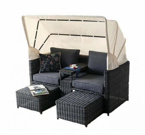 Elegantná záhradná zostava obsahuje 2x kreslo, 2x taburet a 1x clonu. Materiál je odolný voči UV žiareniu a teplote od +50°C do - 10°C. Celá zostava je vhodná ako do interiéru, tak aj do exteriéru.