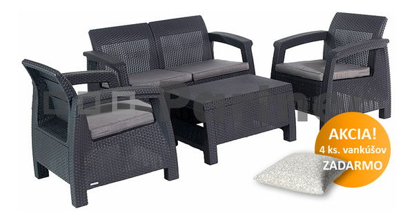 Moderná záhradná zostava Corfu antracit, ktorá obsahuje dve kreslá, dvojmiestnu pohovku a jeden obdĺžnikový stolík, je vyrobená z umelého ratanu. Je vhodná na umiestnenie na balkón, terasu či do záhrady. Vďaka použitému materiálu nemusíte zostavu schovávať do interiéru pri nepriazni počasia. Údržba je veľmi jednoduchá. Stačí mokrá handrička alebo špongia a nábytok je opäť ako nový. Pre väčšie pohodlie pri sedení Vám pribalíme sedáky šedej farby zdarma. Nenasiakavý textilný obal sedákov je možné kedykoľvek zložiť, jednoduchým rozopnutím skrytého zipsu a oprať v práčke. Zostava je dodávaná v demonte, no montáž je veľmi jednoduchá a nezaberie veľa času.