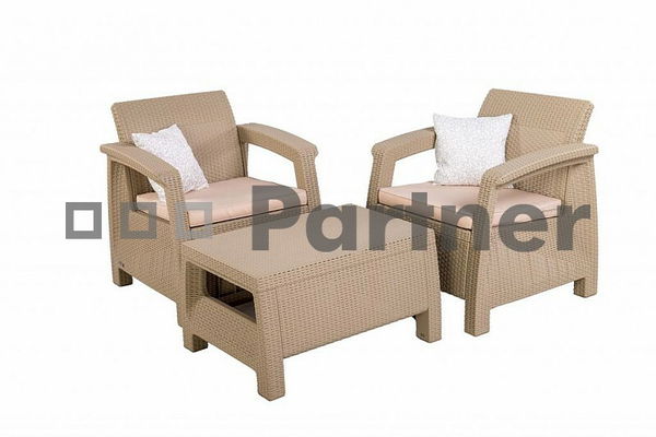 Moderná záhradná zostava Corfu Weekend, ktorá obsahuje dve kreslá a jeden obdĺžnikový stolík, je vyrobená z umelého ratanu. Je vhodná na umiestnenie na balkón, terasu či do záhrady. Vďaka použitému materiálu nemusíte zostavu schovávať do interiéru pri nepriazni počasia. Údržba je veľmi jednoduchá. Stačí mokrá handrička alebo špongia a nábytok je opäť ako nový. Pre väčšie pohodlie pri sedení Vám pribalíme sedáky pieskovej farby zdarma. Zostava je dodávaná v demonte, no montáž je veľmi jednoduchá a nezaberie veľa času.