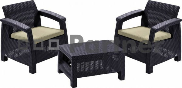 Moderná záhradná zostava Corfu hnedá, ktorá obsahuje dve kreslá a jeden obdĺžnikový stolík, je vyrobená z umelého ratanu. Je vhodná na umiestnenie na balkón, terasu či do záhrady. Vďaka použitému materiálu nemusíte zostavu schovávať do interiéru pri nepriazni počasia. Údržba je veľmi jednoduchá. Stačí mokrá handrička alebo špongia a nábytok je opäť ako nový. Pre väčšie pohodlie pri sedení Vám pribalíme sedáky béžovej farby zadarmo. Nenasiakavý textilný obal sedákov je možné kedykoľvek zložiť, jednoduchým rozopnutím skrytého zipsu a oprať v práčke. Zostava je dodávaná v demonte, no montáž je veľmi jednoduchá a nezaberie veľa času.