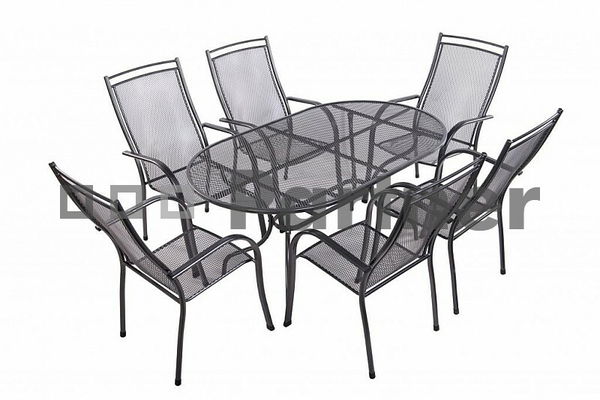 Elegantná kovová záhradná zostava Elton. Oválny stôl má mriežku navrchu. Naklonené operadlá stoličiek zaručia vaše pohodlie. V zostave sa nachádza stôl a šesť stoličiek, ktoré sú stohovateľné.
