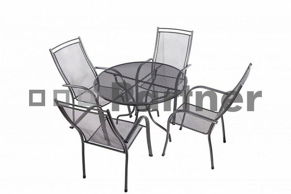 Krásna a moderná zostava Elton vyrobená z kovu skrášli vaše záhrady a terasy. Guľatý stôl má mriežku navrchu. Stoličky majú naklonené operadlá a zaručujú tak vaše pohodlie. Sú taktiež stohovateľné a šetria váš priestor. V zostave sa nachádza stôl a štyri stoličky.