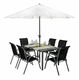 Táto úžasná kovová zostava so slnečníkom pre 6 osôb ozdobí každú terasu a záhradu. Výnimočné spojenie elegantného kovu a odolného skla ohromí všetky návštevy.