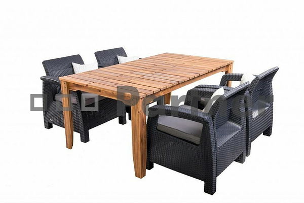 Zaujímavá záhrada zostava Glasgow, ktorá kombinuje masívnejšie ratanové kreslá antracitového prevedenia a drevený stôl z akácie. Zostava sa bude pekne vynímať v záhradách a väčších priestranstvách. V zostave sa nachádza stôl a štyri ratanové kreslá.