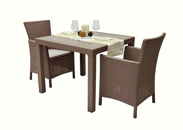 Elegantná záhradná zostava obsahuje 1x stôl a 2x kreslo. Materiál je odolný voči UV žiareniu a teplote od +50°C do - 10°C. Celá zostava je vhodná ako do interiéru, tak aj do exteriéru.