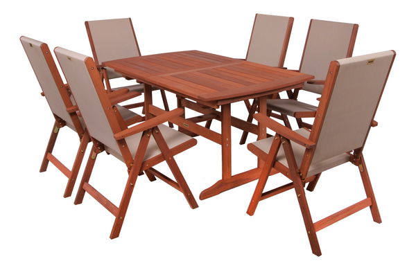Luxusný kombinovaný set šiestich polohovateľných rozkladacích stoličiek a jedného rozkladacieho stola z tvrdého tropického dreva Meranti. Stôl v zloženom stave má dĺžku 154 cm, po rozložení je dlhý 200 cm. Vhodné pre záhradné kryté plochy a interiéry. Pri vhodnom ošetrení Teakovým olejom možno používať v exteriéri.