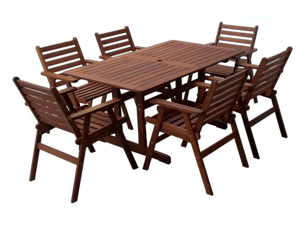 Luxusná záhradná zostava tvorená veľkým stolom a šiestimi stoličkami z tvrdého tropického dreva Meranti. Vhodné pre kryté záhradné plochy a interiéry. Pri vhodnom ošetrení Teakovým olejom možno použiť v exteriéri.