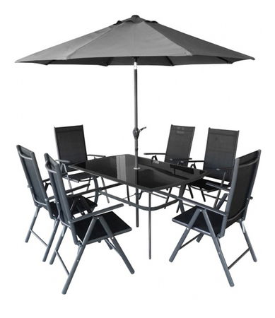 Kombinácia šiestich stoličiek (stohovateľných), jedného stola z hliníkových profil s komaxitovou povrchovou úpravou a jedného slnečníka. Stôl je s tvrdeným čiernym sklom. Možnosť použitia je v exteriéri ale aj v interiéri. Vhodné aj pre použitie vo vlhkom prostredí.