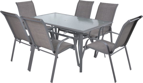 Záhradná zostava šiestich stohovateľných stoličiek a jedného stola s tvrdeným sklom. Vyrobené sú z hliníkových profilov s komaxitovou povrchovou úpravou. Táto zostava je vhodná pre použitie v exteriéri i interiéri. Vhodné aj pre použitie vo vlhkom prostredí.