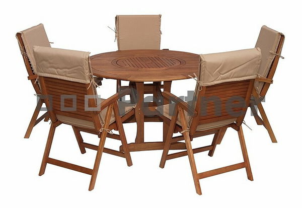 Záhradná zostava Malaga s originálnym okrúhlym stolíkom, ktorý má v strede zabudovanú otočnú tácku. V prípade, že potrebujete podať predmet umiestnený na nej, stači ňou zľahka otočiť a hneď ho máte na dosah ruky. Stolička je pohovovateľná, kde nadvihnutím podrúčiek si viete nastaviť sklon opierky chrbta. K stoličkám sú dodávané aj pohodlné sedáky. Zostava je vyrobená z exotického dreva Eukalyptus.