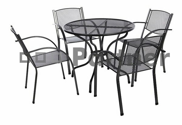 Krásna záhradná zostava Milano s elegantným designom vyrobená z kovu. Okrúhly stolík má mriežku navrchu. Stoličky s nakloneným operadlom sú pohodlné a zároveň sú stohovateľné. Zostava obsahuje stôl a štyri stoličky.