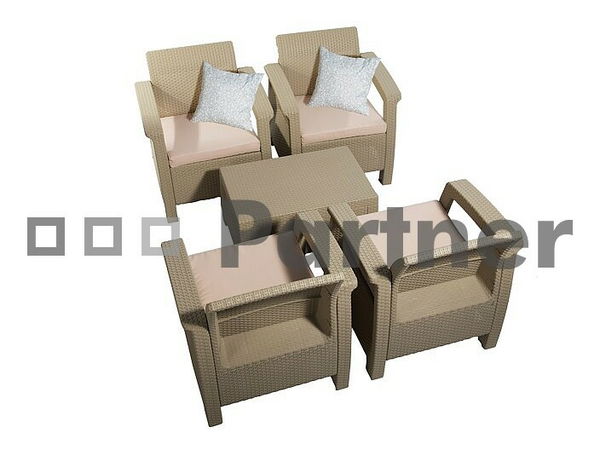 Moderná záhradná zostava pieskovej farby, ktorá obsahuje 4 kreslá a jeden obdĺžnikový stolík, je vyrobená z umelého ratanu. Je vhodná na umiestnenie na balkón, terasu či do záhrady. Vďaka použitému materiálu nemusíte zostavu schovávať do interiéru pri nepriazni počasia. Údržba je veľmi jednoduchá. Stačí mokrá handrička alebo špongia a nábytok je opäť ako nový. Pre väčšie pohodlie pri sedení Vám pribalíme sedáky pieskovej farby zadarmo. Nenasiakavý textilný obal sedákov je možné kedykoľvek zložiť, jednoduchým rozopnutím skrytého zipsu a oprať v práčke. Zostava je dodávaná v demonte, no montáž je veľmi jednoduchá a nezaberie veľa času.