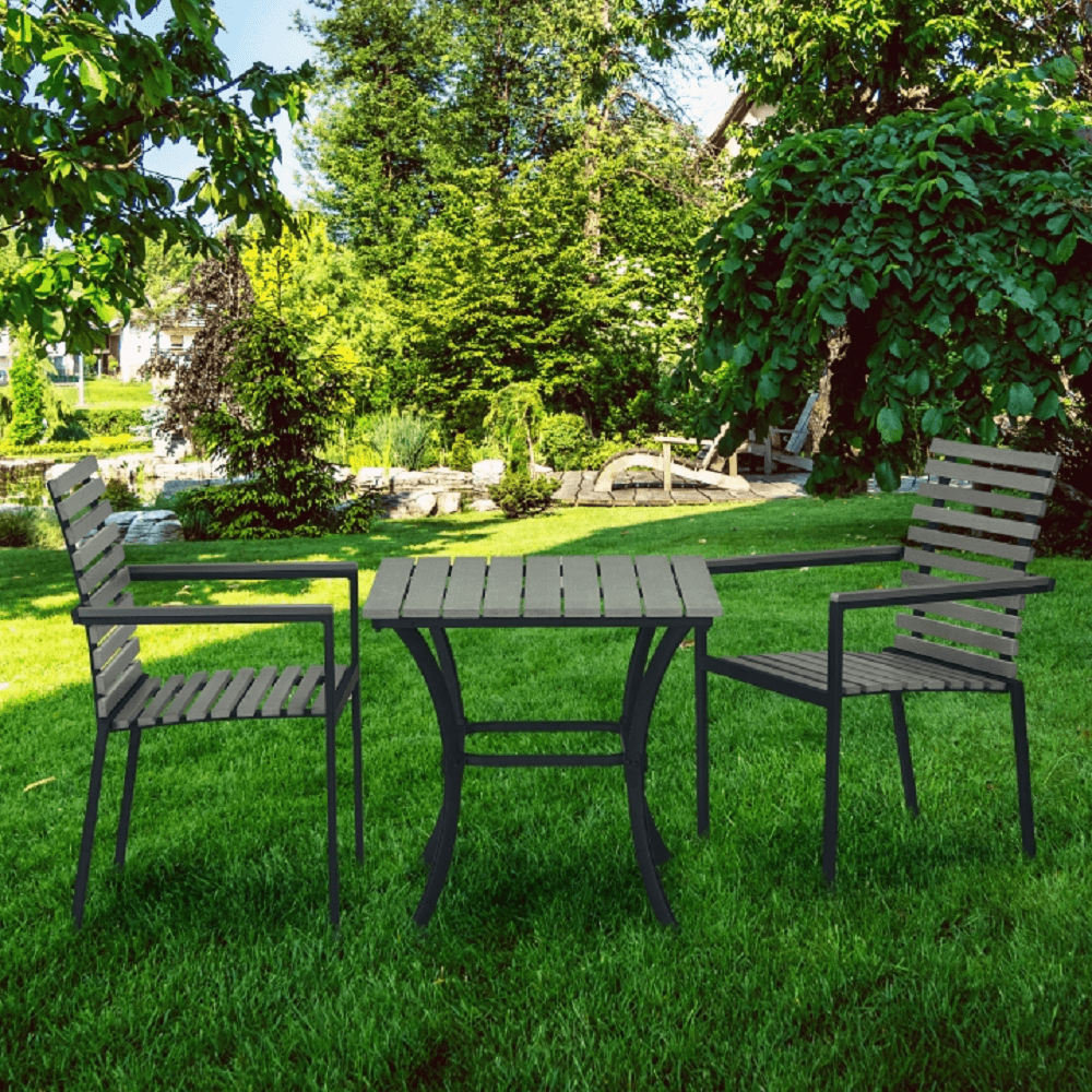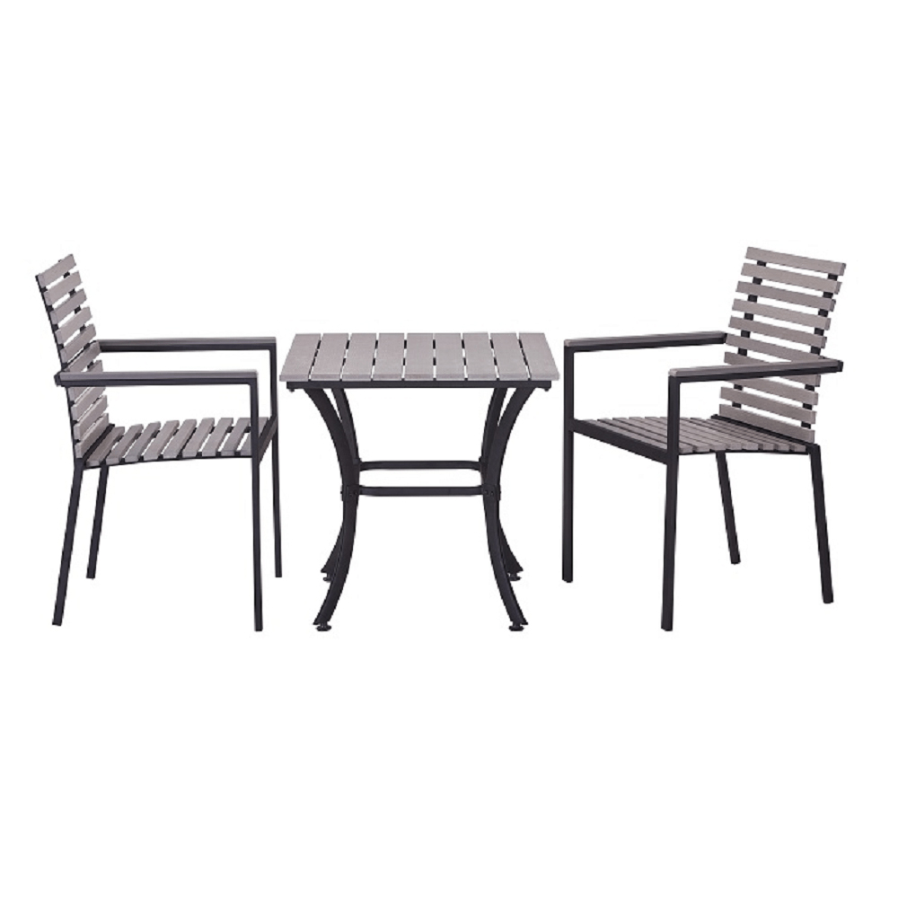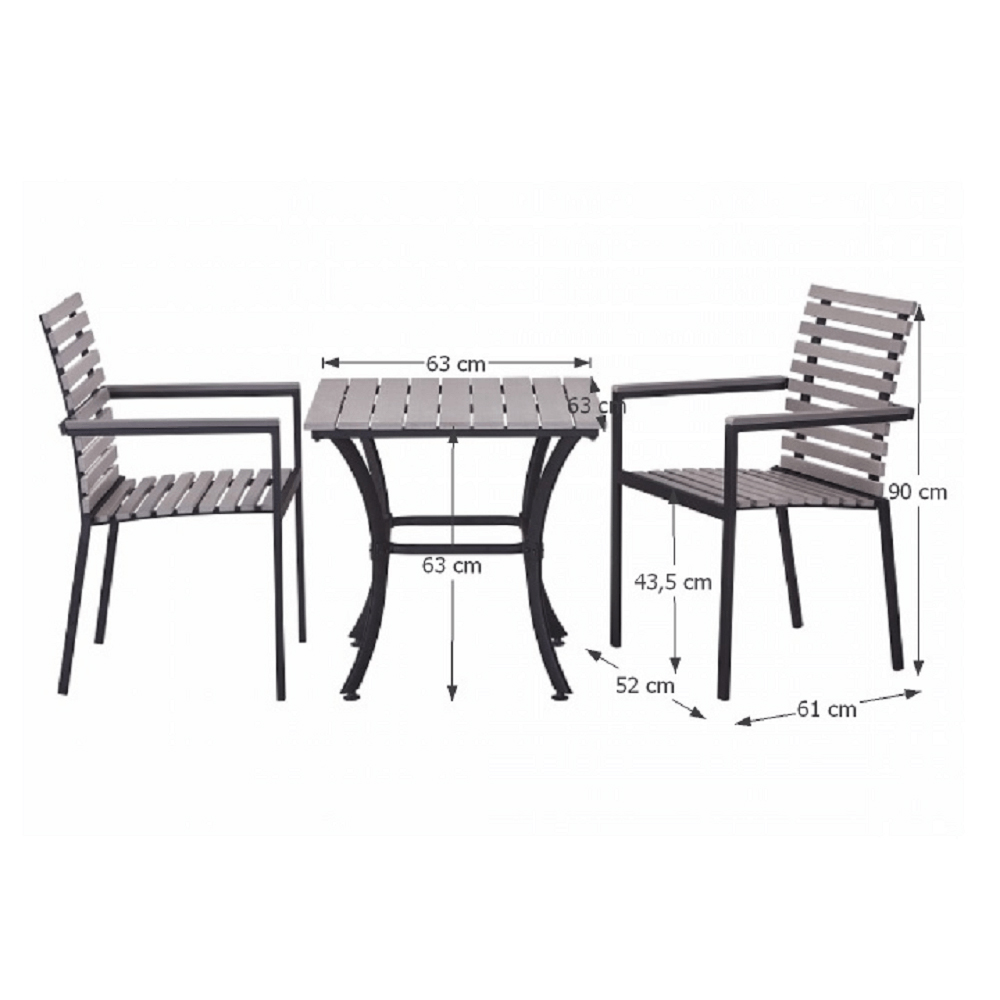 Vychutnajte si príjemný letný relax so záhradným setom Ronan, ktorý sa skladá zo stola a dvoch stoličiek. Roztomilý, minimalistický štýl vás ihneď chytí za srdce. Chvíle vo dvojici si môžete vychutnávať na balkóne, terase, v záhrade, ale aj v interiéry. Set je vyrobený z plastu s povrchovou úpravou v imitácii dreva vo svetlosivej farbe. Spevnený je čiernou oceľovou konštrukciou.