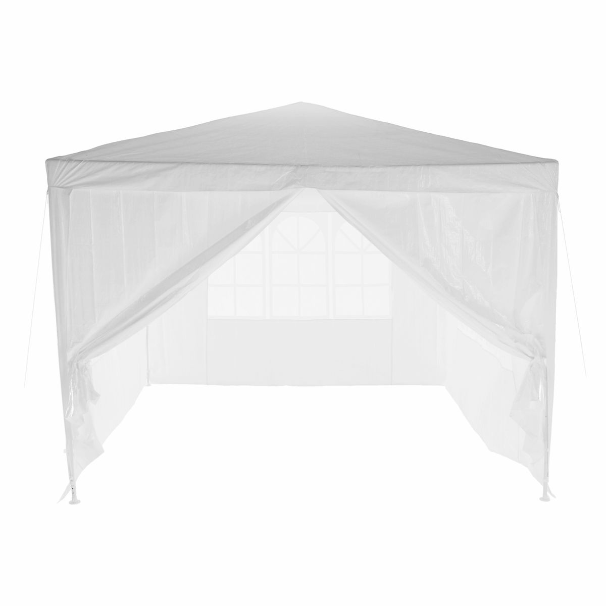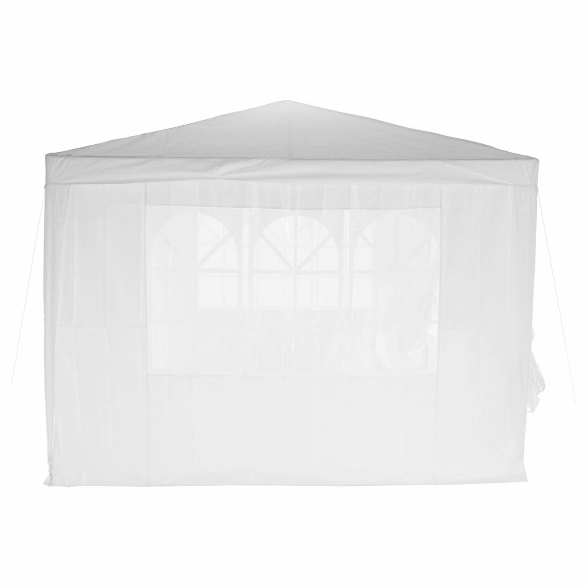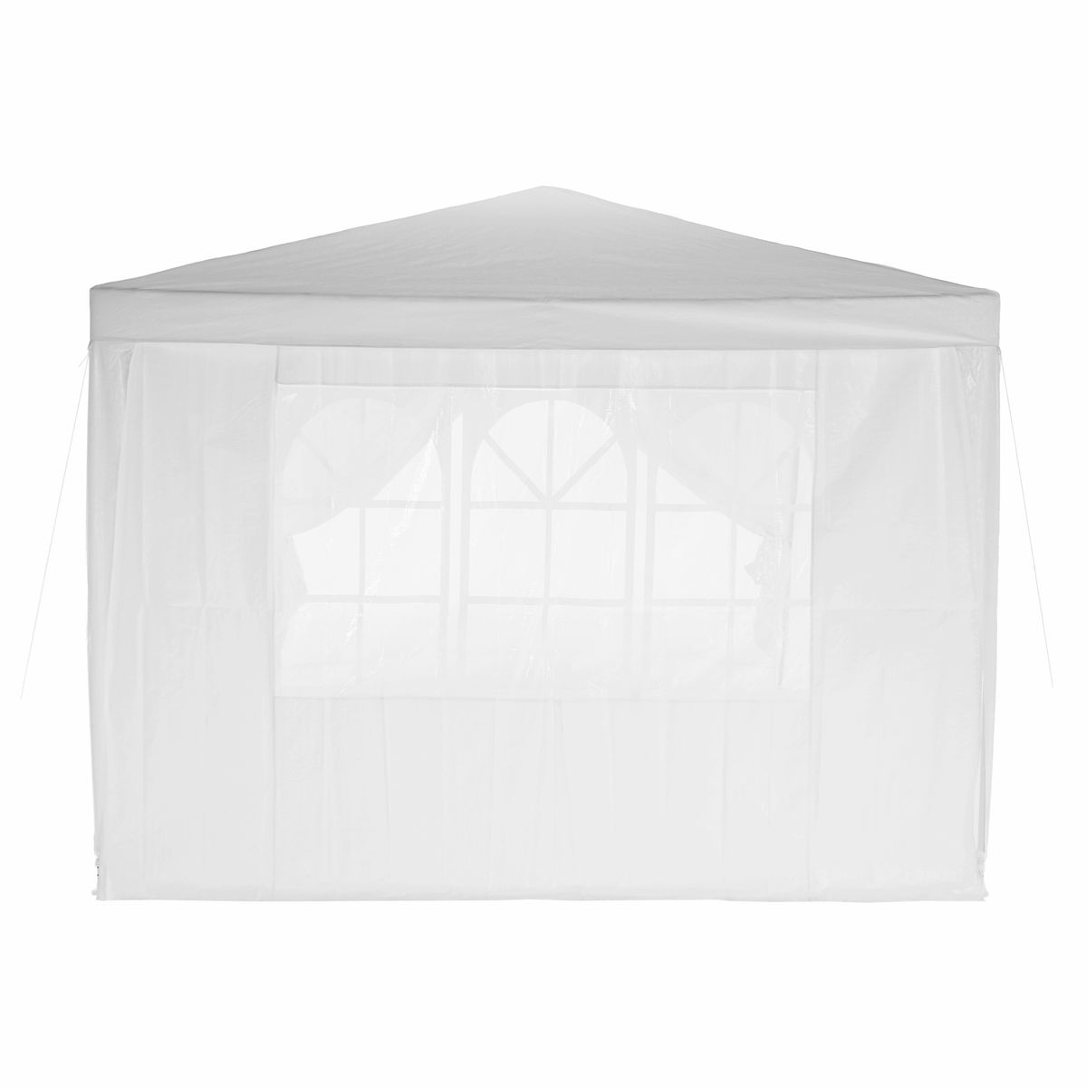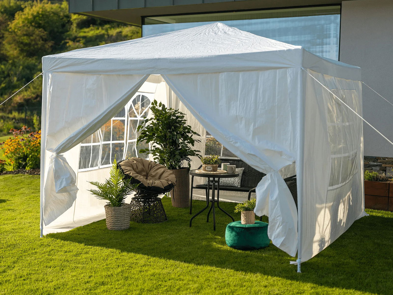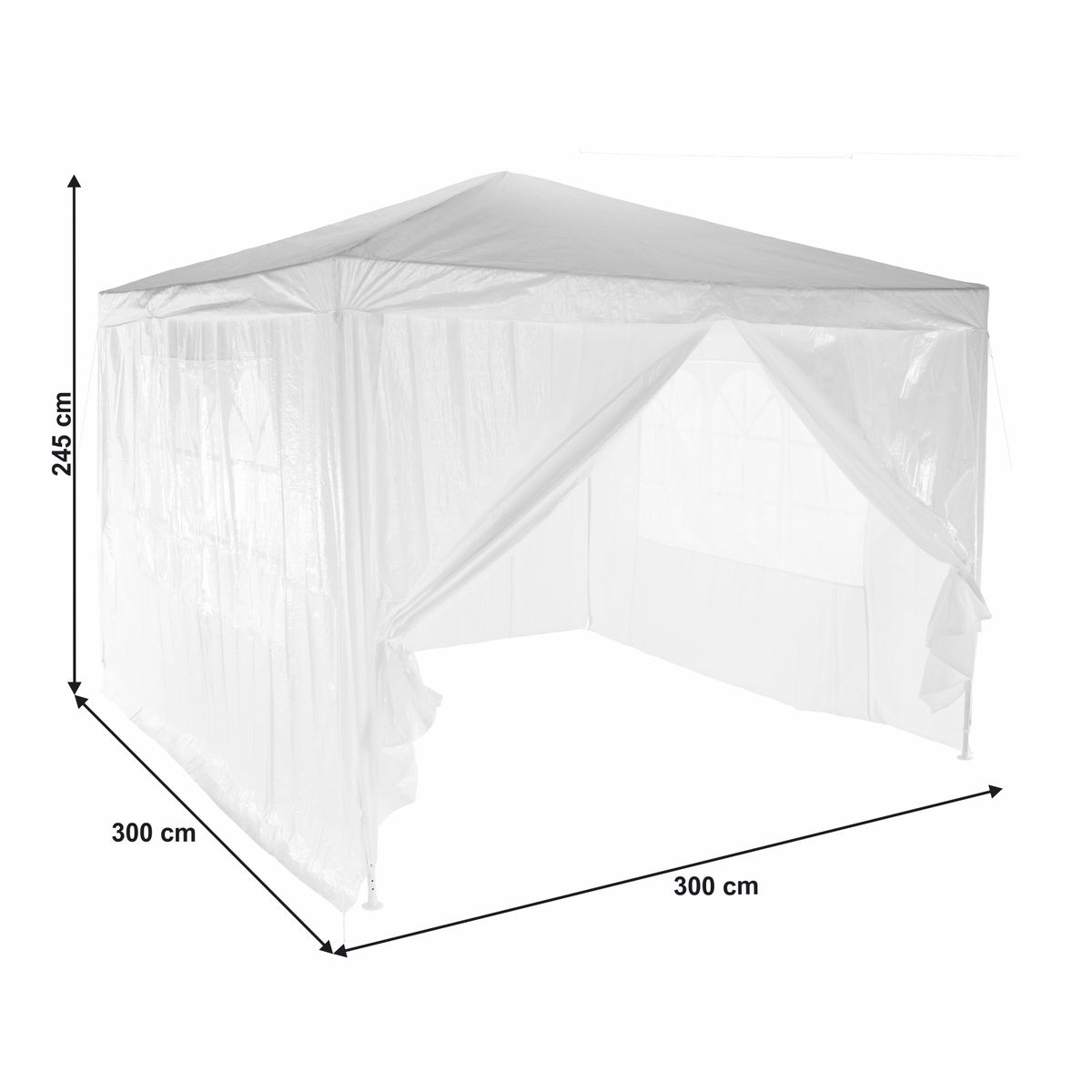 Záhradný párty stan Terno typ 1 s výškou 245 cm a hĺbkou 300 cm v bielej farbe je vyrobený z 100% polyetylénového materiálu a ocele. Má rozmery 300x300x245 cm. Stan je nepremokavý a obsahuje 4 bočné steny s 3 priehľadnými oknami na každej stene okrem vchodu. Jedna stena má zips ako vchod a bočné steny sa dajú ľahko odstrániť. Stan je odolný voči UV žiareniu a chráni pred slnečným žiarením a ľahkým dažďom. Avšak, nevystavujte ho nepriaznivým poveternostným podmienkam. Stan sa dodáva v demonte a odporúča sa nepoužívať ho v zimných mesiacoch, kedy hrozí riziko ťažkých snehových nánosov.