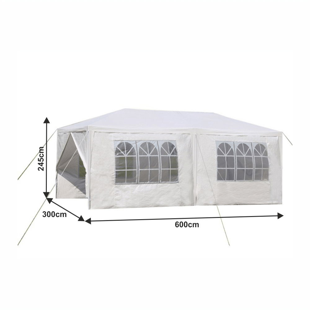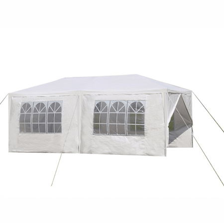 Záhradný párty stan Terno typ 2 je ideálnym riešením pre vaše letné oslavy a akcie. Stan má výšku 245 cm a hĺbku 600 cm, s rozmermi 300x600x245 cm. Vyrobený je z kvalitného, 100% polyetylénového materiálu s oceľovou konštrukciou v bielom prevedení. Stan obsahuje 5 bočných stien, z ktorých 3 sú vybavené priehľadnými oknami pre lepší výhľad na okolie. Jedna zo stien je vybavená zipsom, ktorý slúži ako vchod. Bočné steny sú snímateľné pre ľahkú údržbu a prípadnú úpravu priestoru. Stan je odolný voči UV žiareniu a poskytuje ochranu pred slnečným žiarením a ľahkým dažďom. Je však dôležité nepoužívať ho v nepriaznivých poveternostných podmienkach. Stan sa dodáva v demonte a neodporúča sa používať v zimných mesiacoch, kedy hrozí riziko ťažkých snehových nánosov. Zvoľte si tento kvalitný Záhradný párty stan Terno typ 2 pre úspešné oslavy a príjemné letné chvíle s rodinou a priateľmi.
