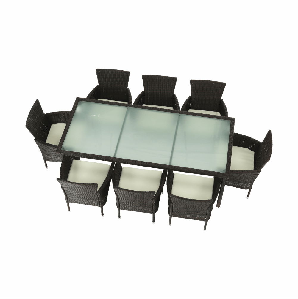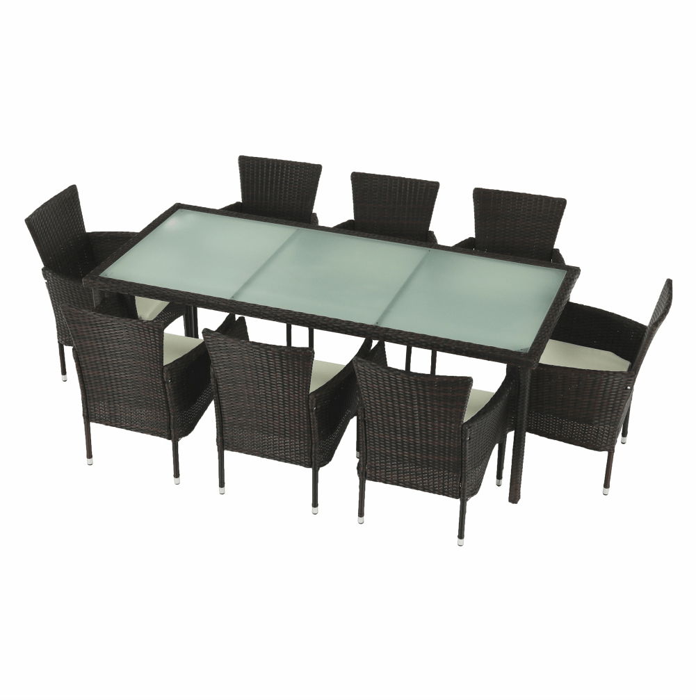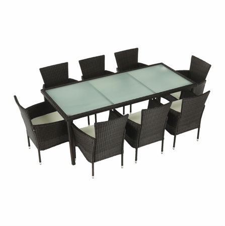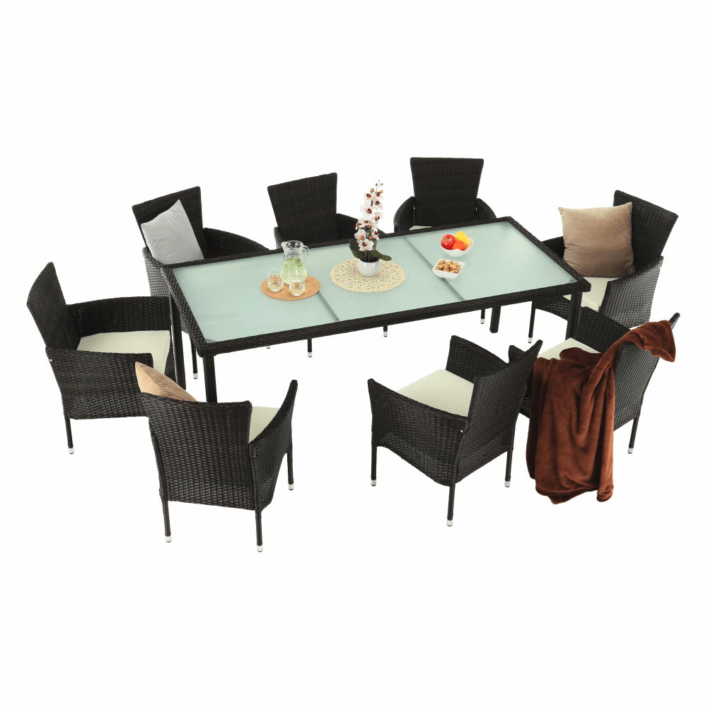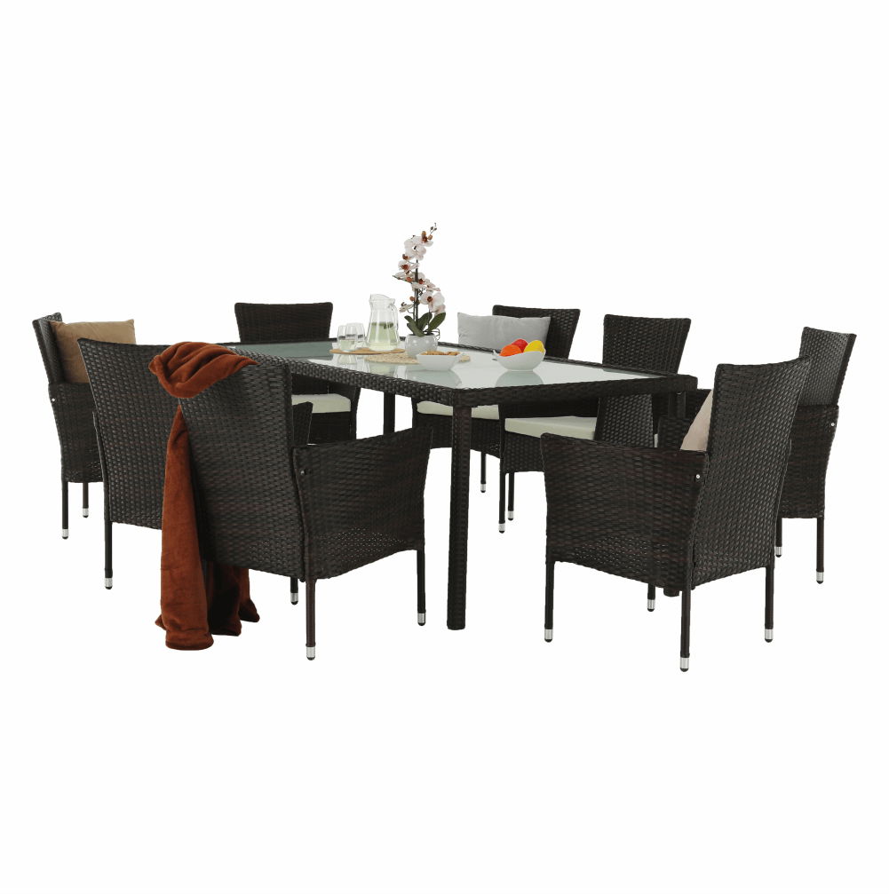 Záhradný set 9-dielny Menaro (hnedá + béžová) je výbornou voľbou pre každého, kto si chce užiť pohodlný čas v záhrade alebo na terase. Set obsahuje stôl a 8 stoličiek, ktoré sú vyrobené z kvalitných materiálov, ako je umelý ratan, látka, oceľ a sklo. Farba setu je hnedá a béžová, čo dokonale zapadne do každého exteriéru. Rozmery stola sú 200x90x74 cm a kresiel 59x62x84 cm, s hĺbkou sedu 45 cm a výškou sedu 40 cm. K setu sú dodávané vankúše hrúbky 5 cm pre väčší komfort. Záhradný set Menaro je 9-dielny, čo znamená, že obsahuje 8 ratanových kresiel a stôl s tvrdeným sklom hrúbky 5 mm. Set je dodávaný v demonte, preto si ho môžete jednoducho a rýchlo zložiť sami. S týmto setom si užijete príjemné chvíle s rodinou a priateľmi v pohodlí a štýle.