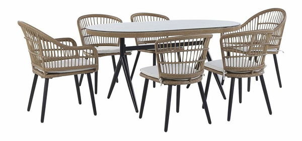 Vyskúšajte túto záhradnú jedálenskú súpravu a užite si príjemné chvíle na terase či v záhrade. S touto 6-miestnou súpravou si môžete byť istí, že nikdy nebudete mať nedostatok miesta pre vašich hostí. Stôl s nádhernou stolovou doskou pokrytou tvrdeným sklom dopĺňa 6 stoličiek s pohodlnými sedacími vankúšmi. Oceľová konštrukcia rámu je doplnená výpletom z umelého ratanu, ktorý je výnimočne ľahký a odolný a nábytku dodáva klasický vzhľad.
