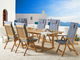 Pohodlne sa usaďte a vychutnajte si stolovanie na čerstvom vzduchu vďaka tejto klasickej vonkajšej jedálenskej súprave. Je vyrobená z vysokokvalitného akáciového dreva vo svetlom prírodnom odtieni, vďaka ktorému dokonale zapadne do akéhokoľvek prostredia. Skladacie stoličky sú vybavené zodpovedajúcimi sedacími vankúšmi pre ešte väčšie pohodlie. Praktická rozťahovacia vrchná doska stola poskytuje dostatok miesta na bežné rodinné večere, ale aj rôzne oslavy alebo večierky v záhrade.