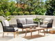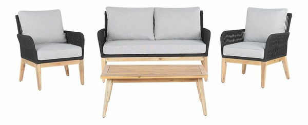 Táto krásna moderná vonkajšia súprava zahŕňa sedačku, dve stoličky a konferenčný stolík. Kombinácia akáciového dreva v svetlom odtieni, výpletu z čiernych šnúrok a sivých vankúšov vytvára vynikajúci dizajn vhodný pre akúkoľvek záhradu, terasu alebo balkón a zároveň ponúka pohodlný priestor na sedenie pre 4 osoby.