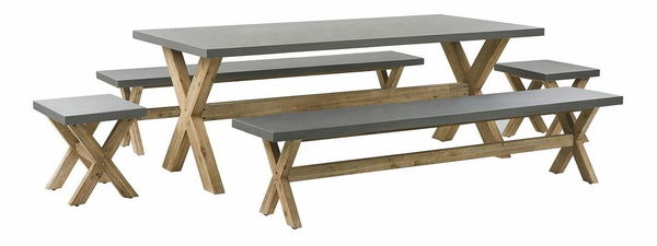 Ak hľadáte spôsob ako premeniť svoju záhradu na dokonalý jedálenský kút, táto súprava je ideálnou voľbou. Za priestranný stôl sa zmestí až 8 osôb, zatiaľ čo lavice a stoličky, ktoré sú súčasťou zostavy, poskytujú dostatok miesta na sedenie. Všetky časti sú vyrobené z materiálov odolných voči rôznym poveternostným vplyvom a vode. Doska stola a sedadlá sú vyrobené z vláknitého cementu, zatiaľ čo podstavce nábytku sú z odolného akáciového dreva. Nábytok sa ľahko čistí a nevyžaduje si časovo náročnú údržbu. Táto zostava najlepšie vynikne v moderných či minimalistických priestoroch, ale vďaka svojmu nadčasovému vzhľadu zapadne takmer do akéhokoľvek exteriéru.