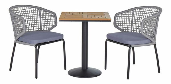 Vďaka tejto elegantnej bistro súprave si v záhrade vytvoríte príjemný kútik na posedenie s priateľmi. Vďaka modernému dizajnu a pletenému operadlu, stoličky dokonale zapadnú do priestorov ladených v tradičnom i minimalistickom štýle. Pevný kovový rám poskytuje stabilitu a odolnosť, zatiaľ čo mäkké, čalúnené sedacie vankúše zaručujú maximálne pohodlie. Štvorcový bistro stolík, s vrchnou doskou zo svetlého dreva, vnesie do akéhokoľvek priestoru rustikálny nádych.