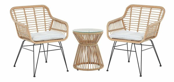 Táto 3-dielna bistro súprava, pozostávajúca z dvoch stoličiek a malého stolíka so sklenenou doskou, zútulní každý balkón alebo terasu. Je vyrobená z odolného umelého ratanu a ocele, vďaka čomu je stabilná a vydrží vám mnoho rokov. Súprava sa dodáva so štýlovými sedacími vankúšmi v sivej farbe, ktoré zabezpečujú pohodlie počas sedenia.