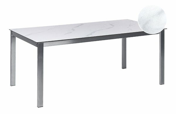 Tento vonkajší jedálenský stôl sa stane moderným a štýlovým doplnkom vašej záhrady alebo terasy. Vrchná doska stola s mramorovým vzhľadom je vyrobená z pevného tvrdeného skla, je elegantná a veľmi odolná, vďaka čomu sa tento stôl stane súčasťou vášho vonkajšieho priestoru na dlhú dobu aj bez každodennej údržby. Strieborný rám vyrobený z nehrdzavejúcej ocele poskytuje stabilitu a odolnosť voči vode, vetru a hrdzi. Priestranná plocha stolovej dosky ponúka miesto na stolovanie až pre až 6 osôb, čo je veľmi praktické najmä pri organizovaní osláv a rôznych záhradných posedení.