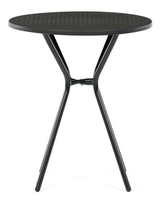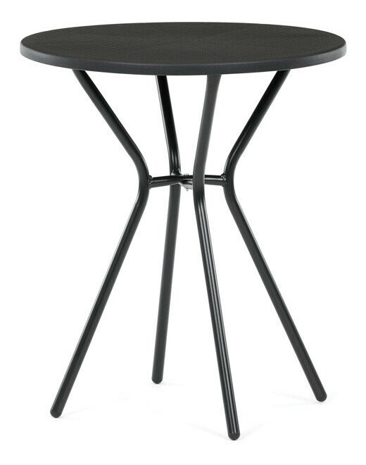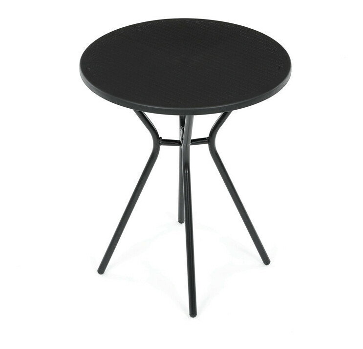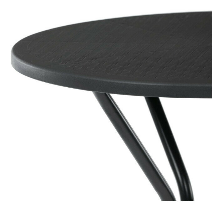 Záhradný stôl s čiernou plastovou doskou a stabilnou kovovou podnožou ponúka praktické riešenie pre vonkajšie posedenie. Okrúhly tvar dosky s jemnou textúrou zabezpečuje jednoduchú údržbu a odolnosť voči poveternostným vplyvom. Kovová podnož je opatrená práškovým lakom, ktorý chráni proti korózii a zvyšuje životnosť stola. Vďaka pevnej konštrukcii stôl poskytuje stabilnú oporu pre rôzne aktivity na záhrade či terase. Kompaktné rozmery umožňujú jednoduché umiestnenie aj v menších priestoroch.