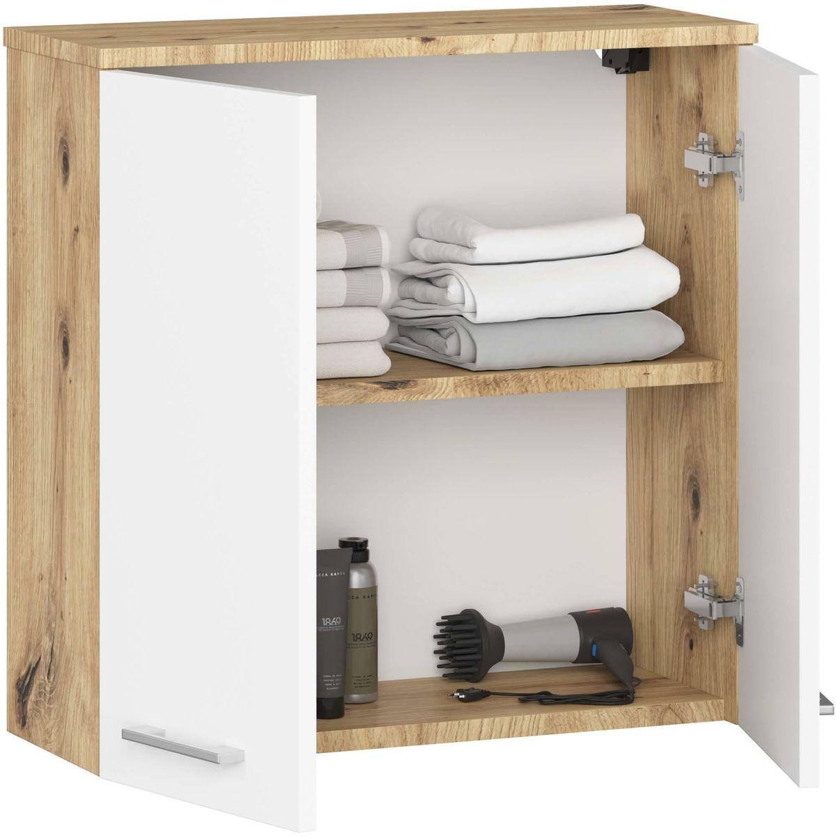 Závesná kúpelňová skrinka Farid TYP5 v kombinácii dub artisan a biela prináša do vašej kúpeľne praktickosť a moderný štýl. Jej pevná konštrukcia z kvalitných materiálov zabezpečuje dlhodobú odolnosť voči vlhkosti, čo je ideálne pre kúpeľňové prostredie.