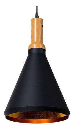 Jednoduchá stropná lampa s jemným industriálnym nádychom. Jej minimalistické čierne tienidlo doplní každý moderný alebo škandinávsky ladený interiér, zatiaľ čo vďaka zlatému vnútornému povrchu je svetlo jasné a príjemné. Vrchná časť lampy je vyrobená zo syntetického materiálu vo farbe svetlého dreva, ktorú skvele zvýrazňuje kábel v tmavej farbe. Lampa sa stane elegantným stredobodom každej miestnosti a krásne vynikne v obývacej izbe, jedálni alebo kuchyni.